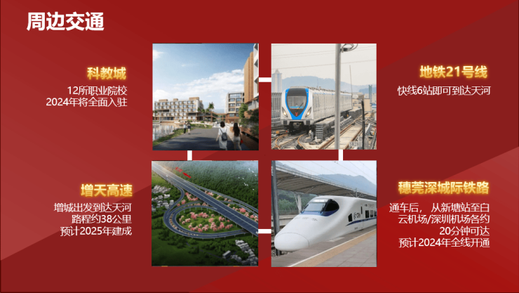 增城位于广州东,南面是东莞和深圳,正处于穗莞深港黄金走廊和广深科技创新走廊的重要节点,广、深两座万亿城市之间的衔接地带。在《粤港澳大湾区发展规划纲要》中,强调以连通内地与港澳以及珠江口东西两岸为重点,构建以高速路、城际铁路和高等级公路为主体的城际快速交通网络,力争实现大湾区主要城市1小时通达。