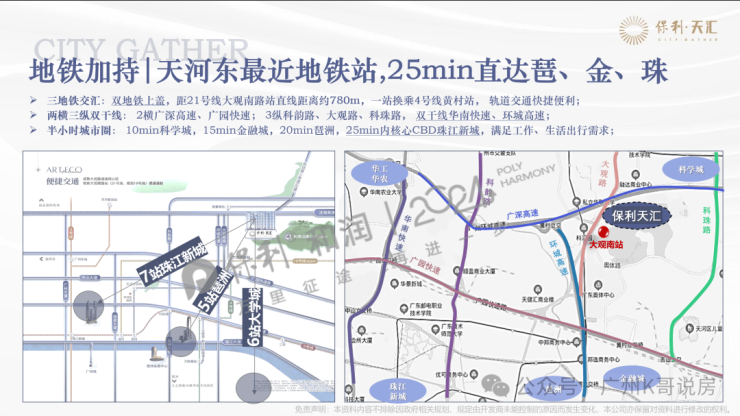 项目距离21号线大观南路站约1.2公里,步行大概需要15分钟,建议买个小电车接驳,一站换乘4号线去往金融城、琶洲,4站到员村换乘5号线直抵珠江新城。
