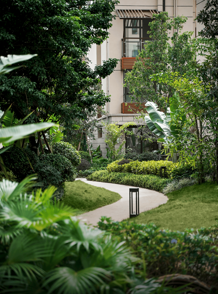 在东南亚风情园林中,融入椰子树、霸王棕、银海枣、火山石等海南当地特色自然元素,让海南的火山群地貌与热带雨林生态,真正地走进日常生活环境中。