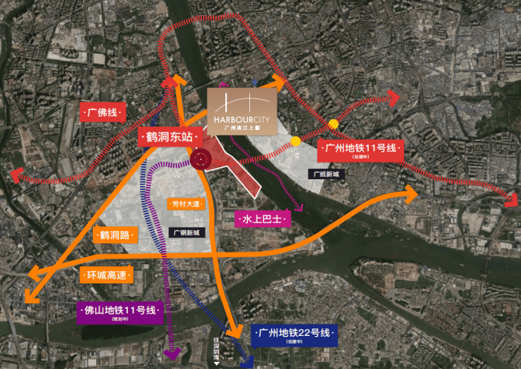 广州11号线以及佛山11号线鹤洞东站双地铁上盖,3横2纵大路网+公交站场+水上巴士,集水、陆、轨等多维交通方式于一体,半小时城央生活圈,1小时湾区生活圈。