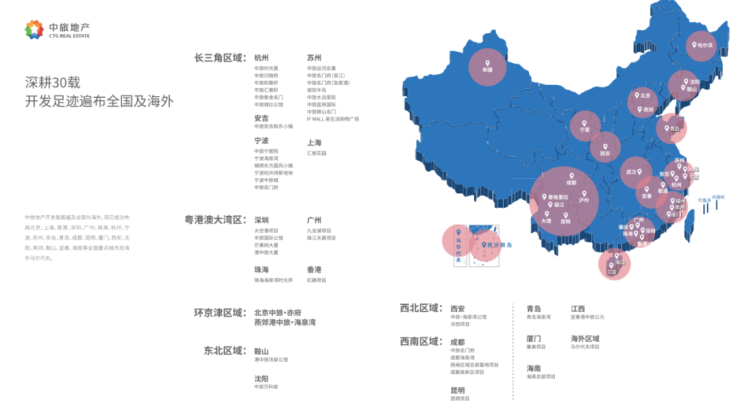 深耕地产30载,开发足迹遍布全国及海外中旅地产是中旅投资旗下专业致力于绿色旅游地产和城市休闲地产开发运营的业务模块,业务涵盖旅游地产、城市地产、商业地产三大产品线,已形成粤港澳大湾区、长三角、环京津、成渝经济圈、关中城市群的区域布局。中旅地产继续深耕重点一二线城市群房地产开发运营,将更具匠心的品质建筑,带到渴求美好生活的人们面前。