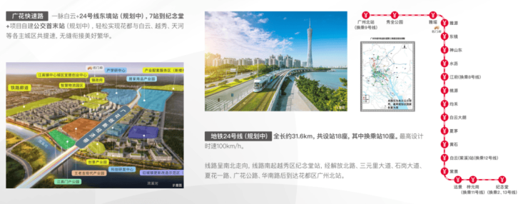 一路通南北,一轨汇东西 广花主轴,未来城市北主轴,作为连接广州北部与市中心的桥梁,重要的南北交通大动脉。家门口在建广花快速路双向8-10车道设计,60公里/小时,白云北开车15分钟就到广州市中心,无缝衔接美好繁华。