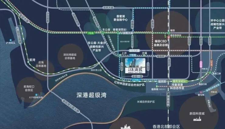 商圈方面:自带15.2万㎡集中式商业,项目购物休闲主要依赖西南侧的绿景佐阾红树林购物中心,距离KK ONE购物中心和未来中洲C Future City约1.5公里左右。