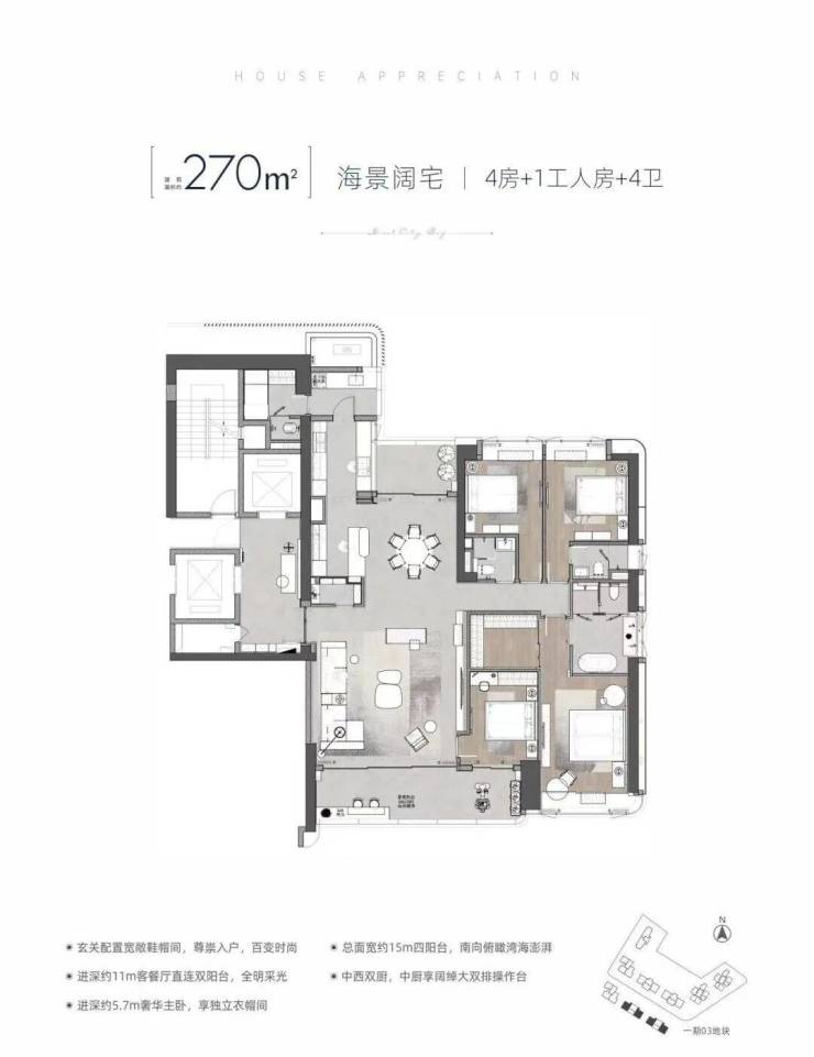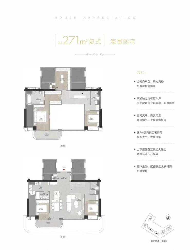 高端居住体验:项目住宅部分设计精良,户型面积从125㎡到270㎡不等,满足不同家庭的需求。大户型层高达到3.3-3.5m,空间感更加开阔舒适。同时,项目采用精装交楼标准,配备高品质装修材料和家具家电,让业主轻松入住