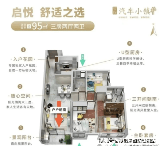 【95㎡三房两卫】:该户型为经典刚需户型,三开间朝南,采光充足,通风效果好。布局紧凑实用,动静分区明确,客厅连接阳台,拓展了活动空间。主卧配备独立卫生间,保障了主人的私密性;两个次卧空间宽敞,可满足儿童房或长辈房的需求。厨房采用U型设计,操作空间充足,方便多人协作。