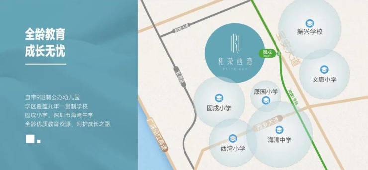 项目自带9班制公办幼儿园,学区覆盖九年一贯制固戍小学、深圳市海湾中学。