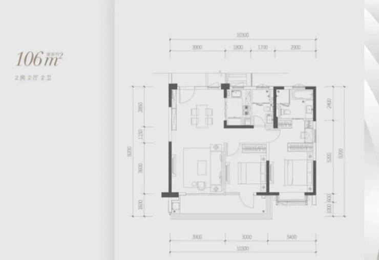 A户型建面约110㎡三房两厅两卫,约6.9m巨幕景观阳台,三开间朝南,独立主套房,带全明大飘窗。