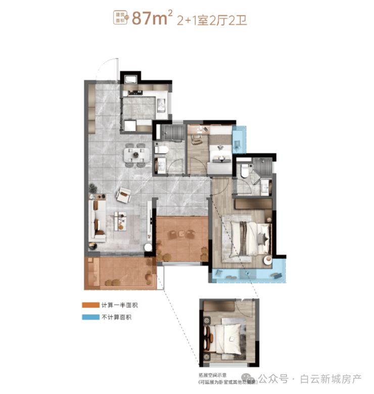 2. 87㎡,三房二卫户型