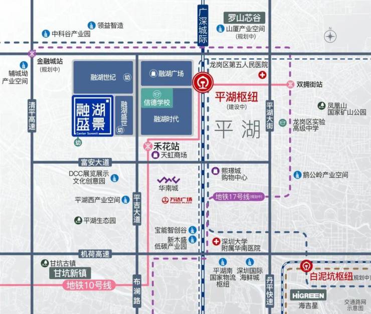 •4地铁:项目距离10号线禾花站约500米(百度测距),连接坂田,直达福田中心区;另有规划中地铁17号线(直连罗湖口岸)/18号线(连通空港新城)/21号线(向西联系南山高新区、前海自贸区等高新区),通勤更高效;