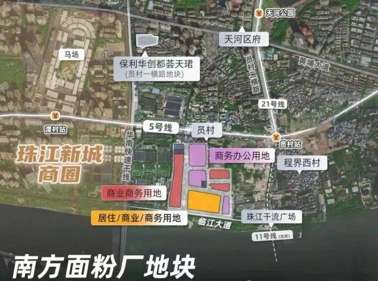 地块东北侧距离地铁5号线与11号线交汇的员村站仅150m,5号线+11号线可以连通广州最核心的几个商务圈---珠城、琶洲、天河北、白鹅潭通达性很强。