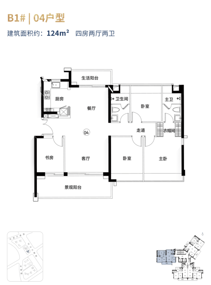 124㎡四房作为PLUS版本,在121㎡的基础上增加了餐厅北侧的生活阳台,景观阳台也延伸至书房,储物与观景功能更完善 。