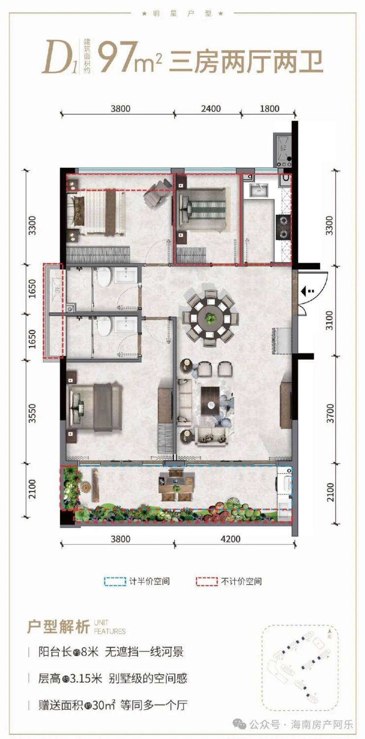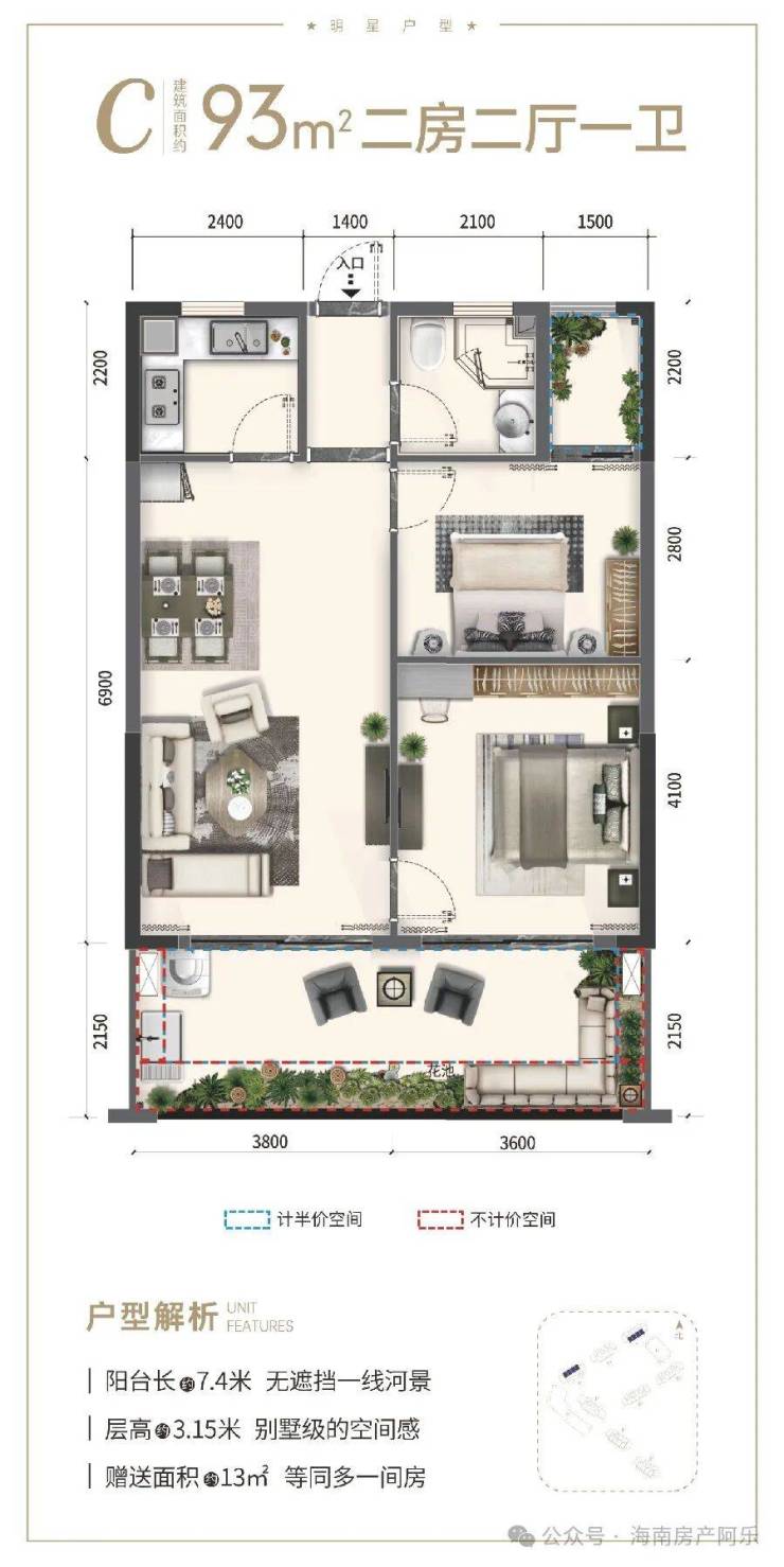 ②产权式酒店,户型南北通透,面积93-145㎡两房至四房。赠送超大面积,93㎡两房一卫、97㎡小三房两卫、115㎡三房两卫、141㎡四房三卫;阳台面宽高达12米,部分阳台可270°三面河景。