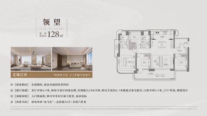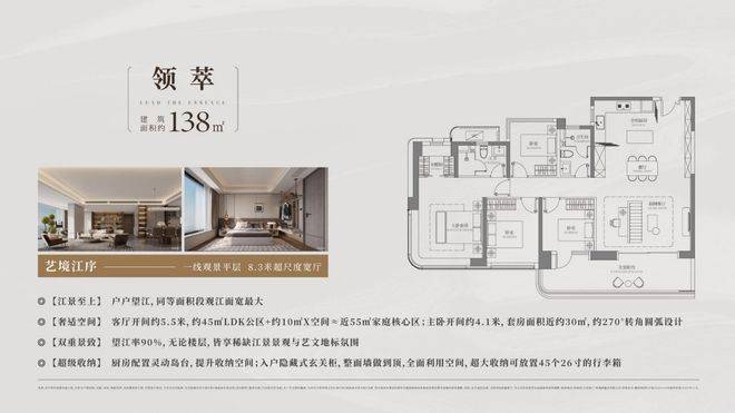 主力户型为128㎡和138㎡三至四房,183㎡则定位为大平层改善产品。以138㎡为例,进门后玄关右侧预留了完整的收纳系统,左侧是通透的客餐厅一体化空间,阳台进深达2.1米,足够摆一张小桌喝茶看江。主卧采用双通道设计——既可从卧室直通卫生间,也能通过衣帽间进入,动线互不干扰。厨房U型布局,操作台面总长超4米,美诺六件套(蒸烤一体机、洗碗机、灶具、抽油烟机、冰箱、咖啡机)全部嵌入,省下的空间刚好放下一张早餐吧台。而183㎡户型在此基础上,厨电全面升级为嘉格纳七件套,连红酒柜都预留了专属位置,适合对烹饪有更高要求的家庭。