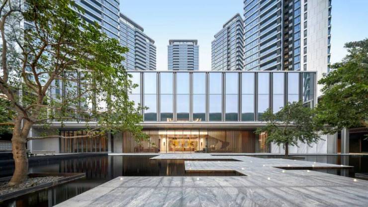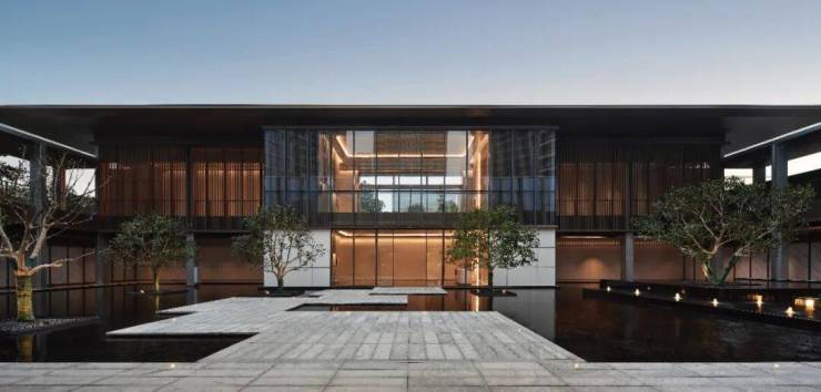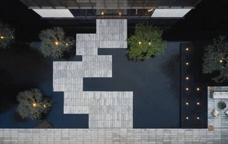 廊道高低错落、蜿蜒穿梭,格栅层叠如林,行至此间豁然开朗,泗水归堂的形制铺展眼前,阔池映天、高树蔽日,尽可静坐慢赏云卷云舒。设计以 “流通空间” 为核心理念,实现室内空间与庭院景致的无界对话,让室外风光自然渗透室内肌理;连廊细节精工雕琢,百叶装置可开可合,营造出丰富多变的空间体验,尽显项目的精致格调。