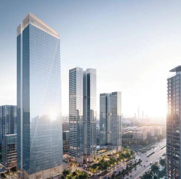 粤海・云港城深度呼应白云山肌理,以山形为设计蓝本,采用中间高、南北阶梯式递减的建筑群布局,将 150 米长的城市天际线铺展为徐徐展开的 “画卷”,让建筑形态与山景相映,恍若一幅立体的建筑山水图,实现城与山的自然共生。