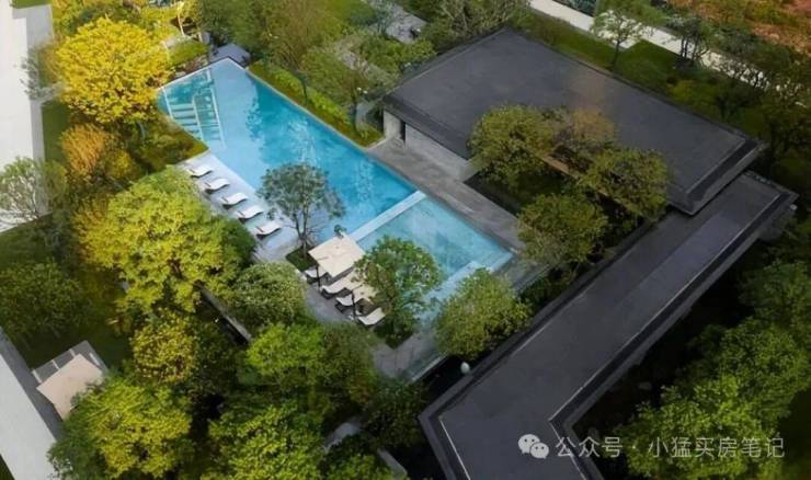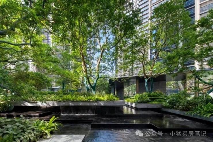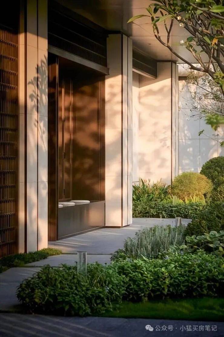 这里没有程式化的绿化点缀,而是以完整的“山、林、水、谷、岛”地貌逻辑,打造出一座可游可赏的自然公园。树木舒展,花草层次丰盈,行走其间,如同漫步于一片被精心打理的野趣森林。更打动人的是无数重合度极低的细节:入口处叠水与酒店式落客区虚实相映,将喧嚣温柔滤净,安缦式的隐奢与宁静,从归家第一刻便已奠定。