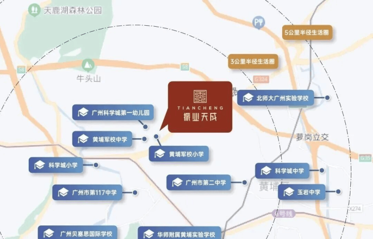 距离项目约20米就是省一级黄埔军校小学、黄埔军校中学,目前已是广大附中旗下的核心学校。周边还有一所科学城实验小学(原黄陂小学)。