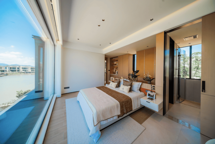 二楼是纯粹的居住空间,奢华主卧设计营造足够的私密性,带独立衣帽间、卫浴,巨幕全景飘窗,低眉就是碧波荡漾的迤逦风光,非常吸引眼球。