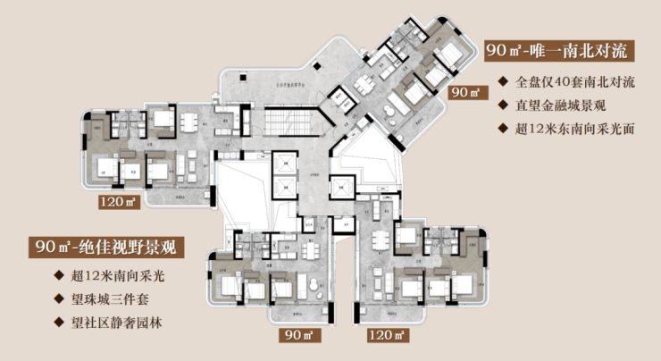 设计好处是既保证了通风、采光,还保障了侧向江景和珠城景观的最大化。