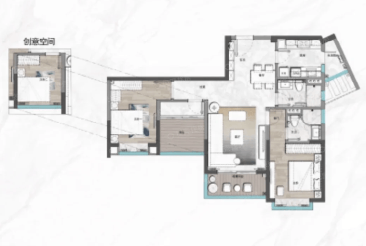 建面115㎡三房两厅两卫,双阳台设计,主次卧分开,私密性好。