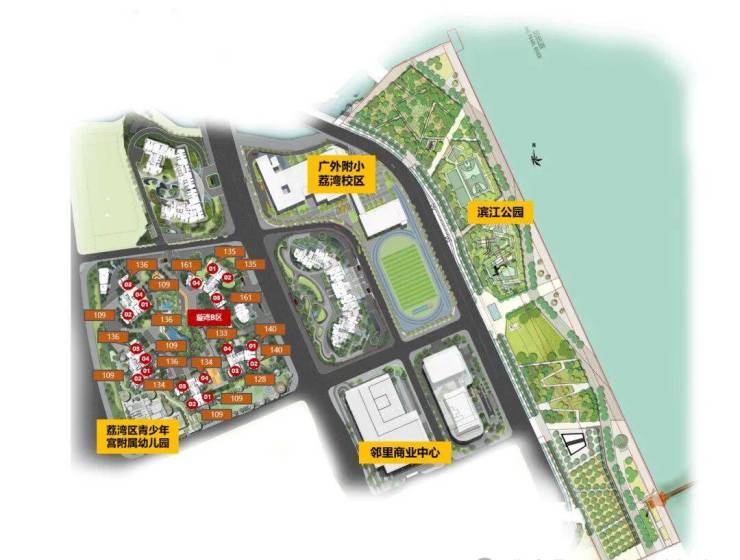 🔘广州滨江天地·璇湾,为广州滨江天地第一期组团,总占地123653㎡,总建筑面积317811㎡,总计容面积约230000㎡(含小学),配建一所12班幼儿园(荔湾区少年宫附属幼儿园)及一所30班小学(广外附小荔湾校区)。