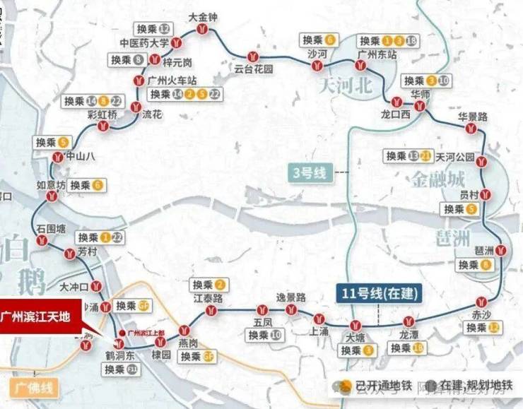 🔘广州11号线以及佛山11号线鹤洞东站双地铁上盖,3横2纵大路网+公交站场+水上巴士,集水、陆、轨等多维交通方式于一体,半小时城央生活圈,1小时湾区生活圈。 11号线共设32个站点,全长44.2km,途经天河、白云、越秀、荔湾和海珠等5个含金量极高的区域,并连接广州火车站、广州东站等交通枢纽。