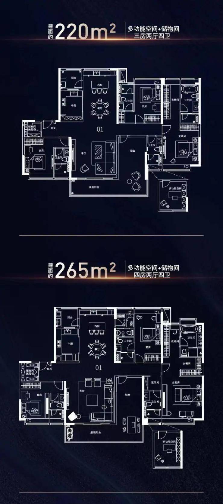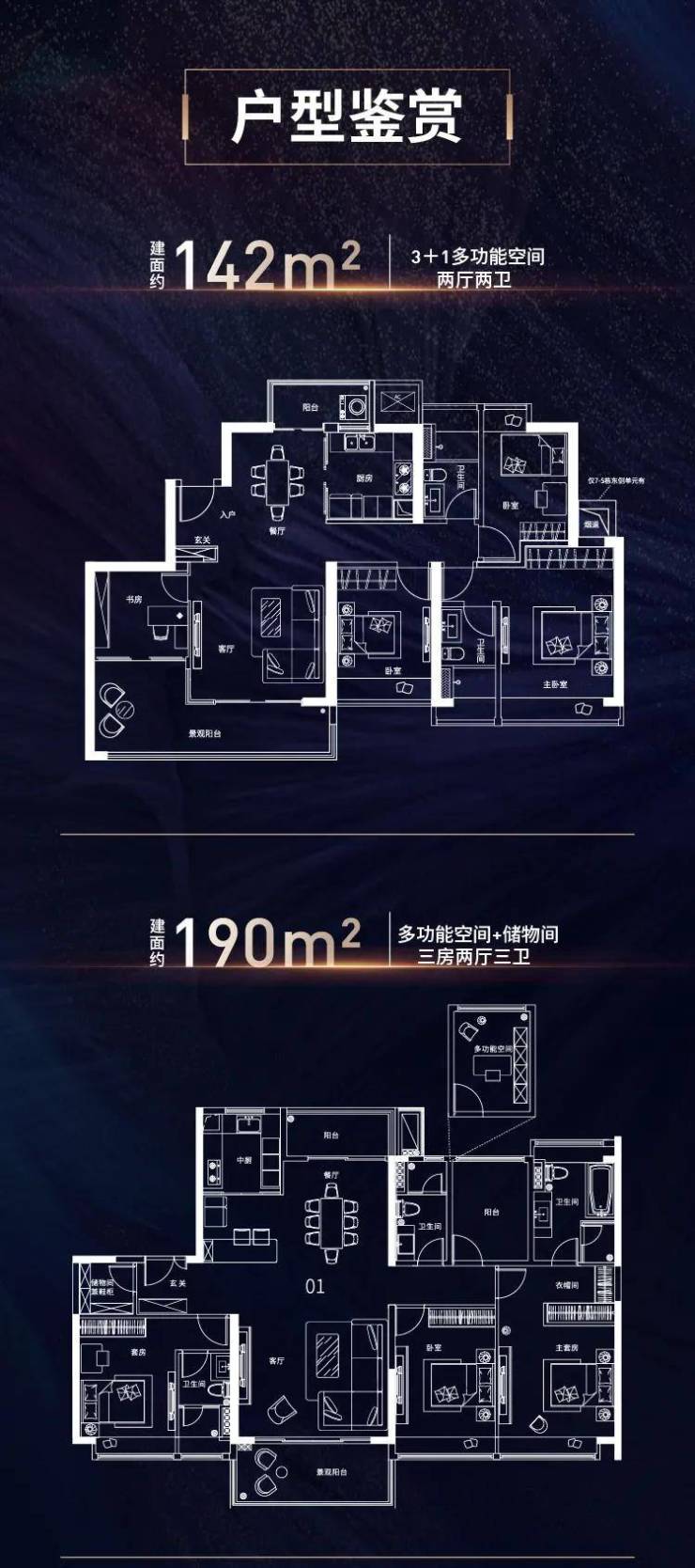 规划142-265㎡海景大宅,整个项目都是两梯两户纯板式设计,尊享大开间,超6米宽阔大阳台,全系海景大平层,南沙乃至广州少见户户南北对流设计,拥有一线南向宽阔海景。