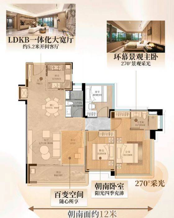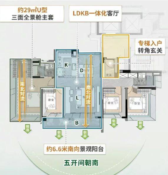 建面约87㎡四房:中轴稀缺新规小户型,LDKB一体化布局,约11.6米南向面宽,四开间朝南,超高使用率实现“一步到位”的四房生活。