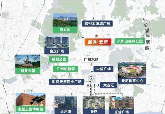 项目西侧紧邻白云山,推窗即见苍翠山景,步行即可抵达山脚,真正实现“一半繁华,一半自然”的理想栖居。周边5公里范围内汇聚天河城、正佳广场、太古汇、天环等顶级商业体,信达金茂广场亦在1.3公里内,满足日常购物、餐饮、娱乐全维需求。医疗资源同样丰沛,南方医院(全国排名第19)、广东省妇幼保健院、三九脑科医院等10所三甲及专科医院环伺,健康保障无忧。