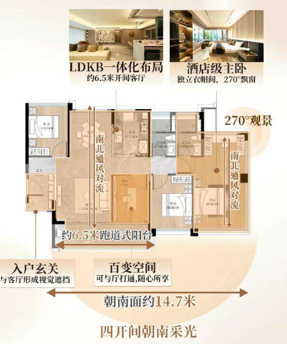 建面约106㎡四房:超130%使用率,约14.7米南向面宽,餐客厅与主卧双轴线南北通透,独立玄关强化归家仪式感。