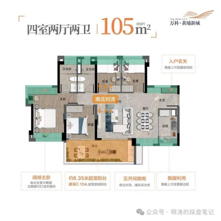 4.6米开间的超宽客厅!!三房有这尺度超罕见,阳台连客厅,中间0承重墙,封窗后面积更大!主卧转角飘窗,采光MAX