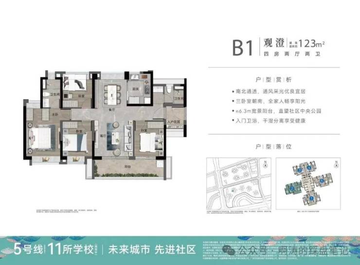 约123㎡南向4房,约143㎡南向4房,约93㎡北向3房。87方北向3房