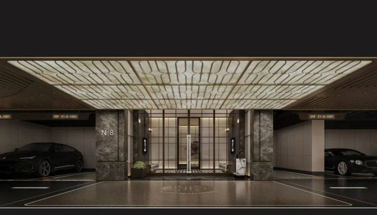 车库入口配置星空穹顶,搭配奢华型迎宾背景墙,内部打造透光云石穹顶、铝格栅吊顶、仿石漆天花、高品质金刚砂+地坪漆双重工艺等豪奢配置。