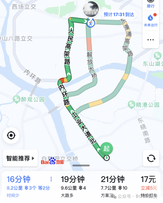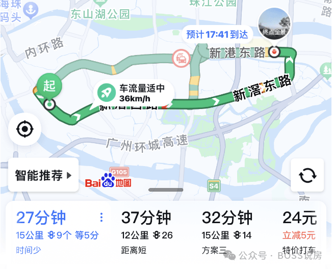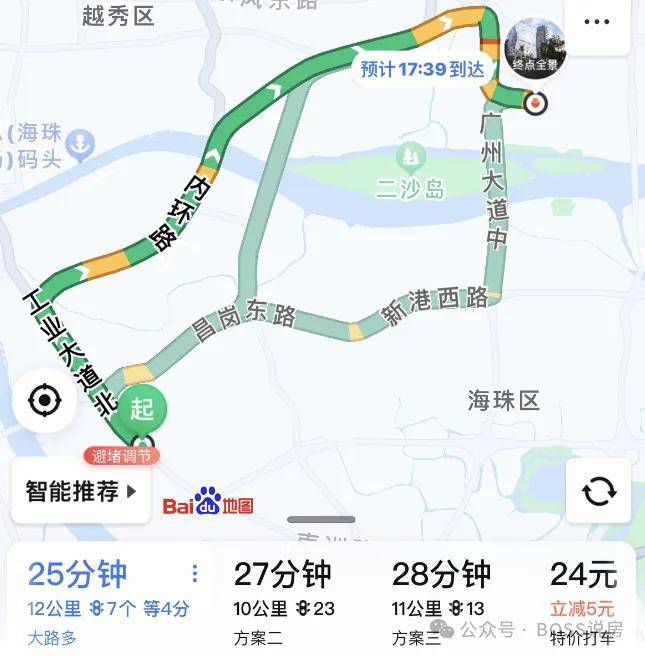 自驾到珠江新城,走工业大道转内环,7个红绿灯,大概25分钟左右;