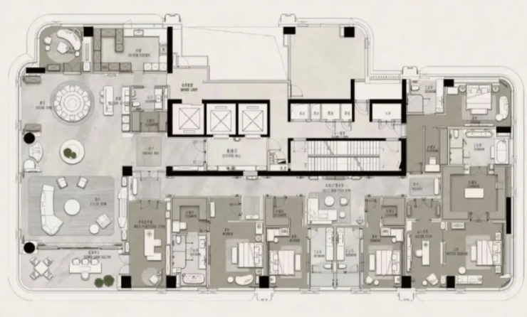 226-227㎡为4房4卫,88.4m大方厅搭配超宽落地景观面,多数房间可望江。