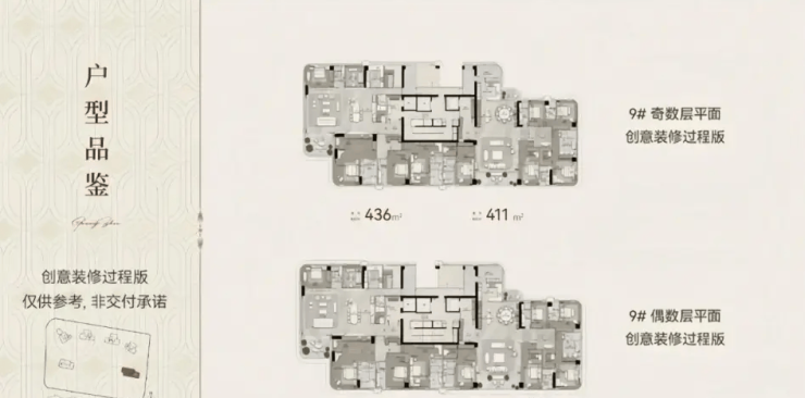 9号楼37层高,在售411㎡、436㎡5+1房户型,3T2户设计,815m或1012.5m大空间客餐厅,动静分区明确,带10.7㎡全赠送共享平台。