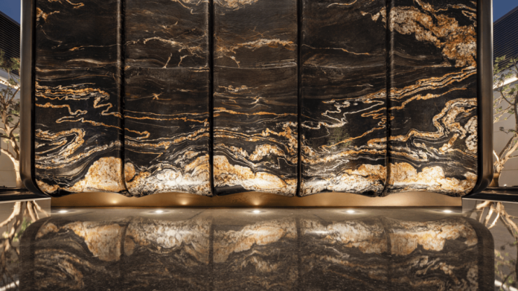 一进院“珠水归庭”,是广府“水脉聚财”理念的极致表达。正面黑金照壁高9米分5片,石材纹理如江浪奔涌。