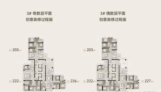 目前保利玥玺湾在售户型丰富,覆盖203㎡至630㎡的多个面积段,均为当前真实在售房源。其中3号楼为50层高,在售203㎡、222㎡、226-227㎡三种户型,4T3户设计,配有独立电梯及门厅;