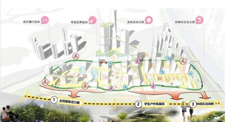 设计方案以“构建生态滨水社区、创新集聚枢纽综合体”为理念进行布局,打造世界级综合体。高度控制方面,项目主体建筑高度控制为125米以下,临近轨道站点地标建筑控制为不超过265米,满足白云山看珠江新城视廊的管控要求。将打造琶洲南部城市簇群,丰富城市天际线纵深层次,协同琶洲西区构建黄埔涌两岸城市对景。该项目南北向沿华南快速干线塑造了“万亩果园-赤沙片区-珠江新城”梯级抬升、峰谷起伏的天际线,东西向融入了珠江城市景观带天际线背景。地块总体呈前低后高的空间格局,向轨道站点核心抬升,形成集聚焦点。