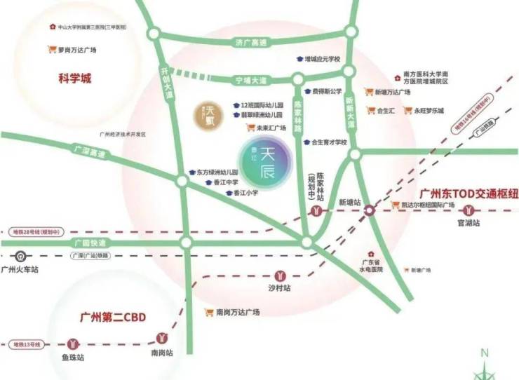 还有规划中的28号线的陈家林路站,距离项目大概只有900米左右,目前规划站点在合生湖山国际那边,但还是存在一定的不确定性,地铁建好开通以后,坐地铁去天河、海珠、黄埔等区也非常方便。