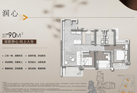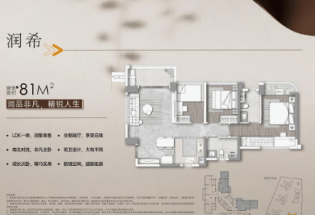 天河润府采用了创新蝶式楼型设计,整体抬高约11.2米,含地块抬高约5.2米+架空层约6米,使住宅起始层相当于别人的4F,提升了私密性和居住体验。所有户型实用率超100%,得房率高,采光良好。例如81㎡户型三面采光,90㎡户型四开间朝南。
