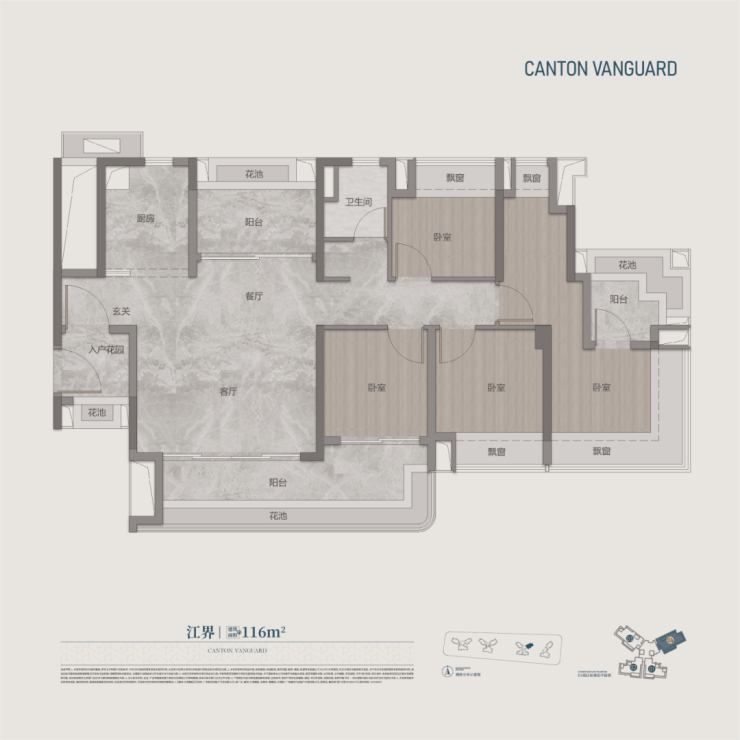 建面116㎡的4空间2厅2卫,南北通透,灵动宽厅,带独立入户玄关,双L型景观面,拥有双面宽巨幕瞰江阳台。