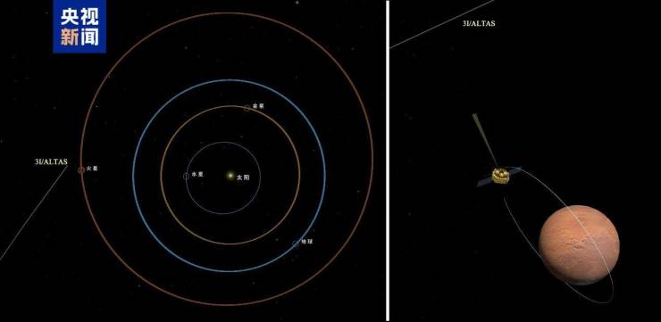 星际天体阿特拉斯与天问一号火星环绕器相对位置示意图。(图片来源:央视新闻)