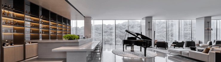 项目外立面全玻璃幕墙,大面积光影立面折射出尺度恢弘的山景天幕,奢享无界视野,尽揽四季轮转,顶级豪宅专属。