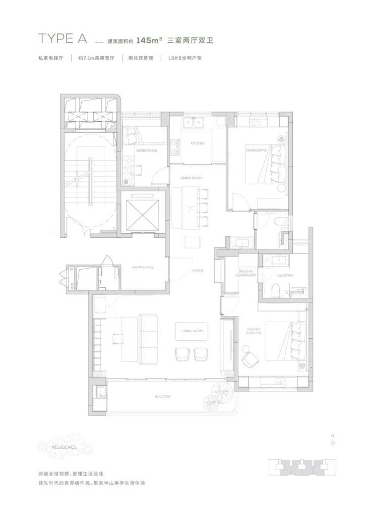 【145㎡户型】独享私家电梯厅-约7.2m²森幕宽厅-LDKB全明户型