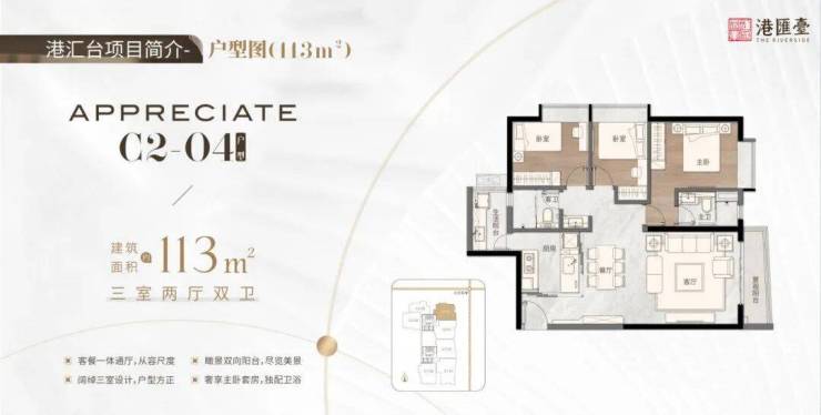 113㎡三房两厅两卫,阔绰三室设计,户型方正,釆光面广,瞰景双向阳台,尽览美景,奢享主卧套房,独配卫浴