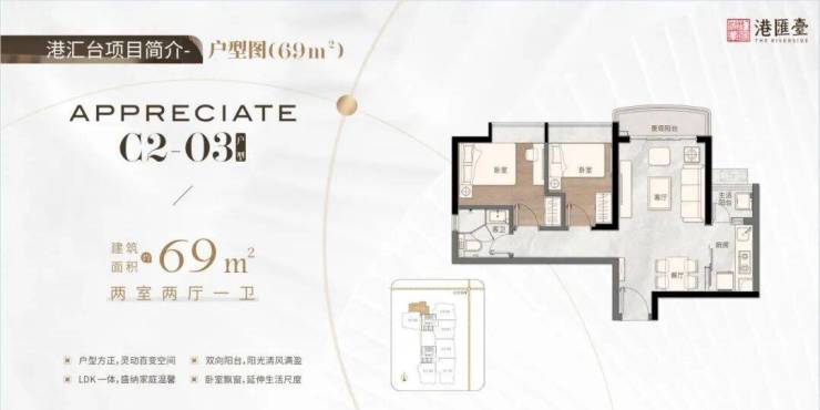 69㎡双阳台两房两厅一卫,户型方正,灵动百变空间,LDK一体,盛纳家庭温馨,双向阳台,阳光清风,视野开阔,全飘窗设计,增加室内利用空间