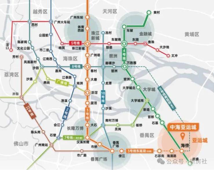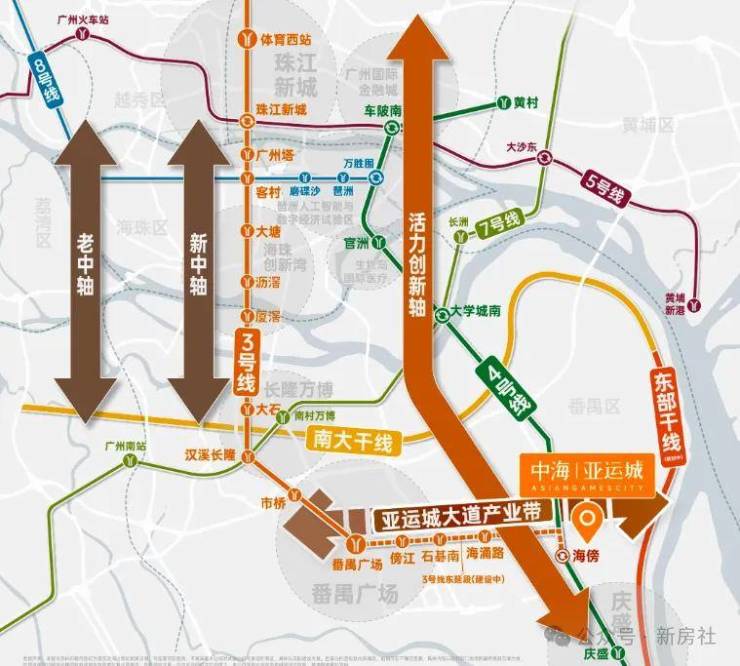 多条地铁也从片区穿过,其中,亚运城正位于3、4、8号线3条地铁线路的交汇处(3号线东延段在建、8号线规划中),从亚运城出发,2站到思科智慧城,3站到大学城,7站可到天河。其中,亚运城毗邻的海傍站还是3号线东延段的始发站,地铁限流、没位置坐等问题,在亚运城统统不用担心