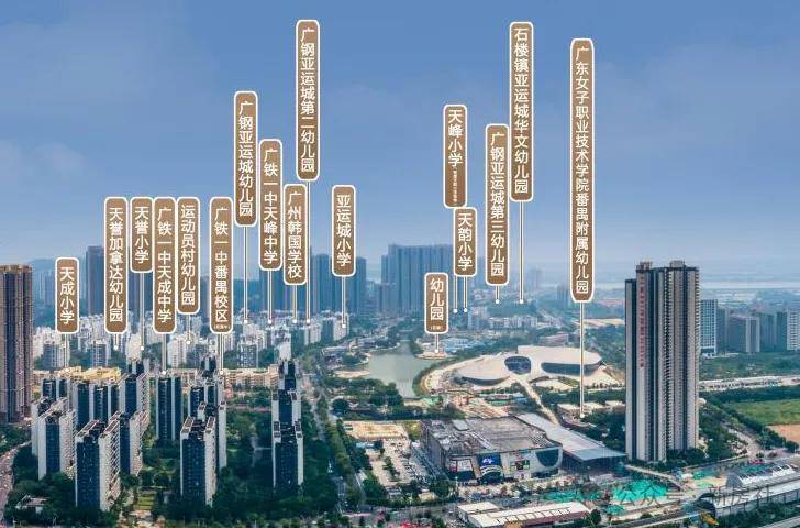 亚运城总共规划有19所学校,18所已开学,单是广铁一中就有4所,城内涵盖9所幼儿园、5所小学、3所初中、2所高中,其中16所已建成,省一级的广铁一中番禺校区、广铁一中天成中学、广铁一中天峰中学,以及亚运城小学、天誉小学等14所学校都已建成投用