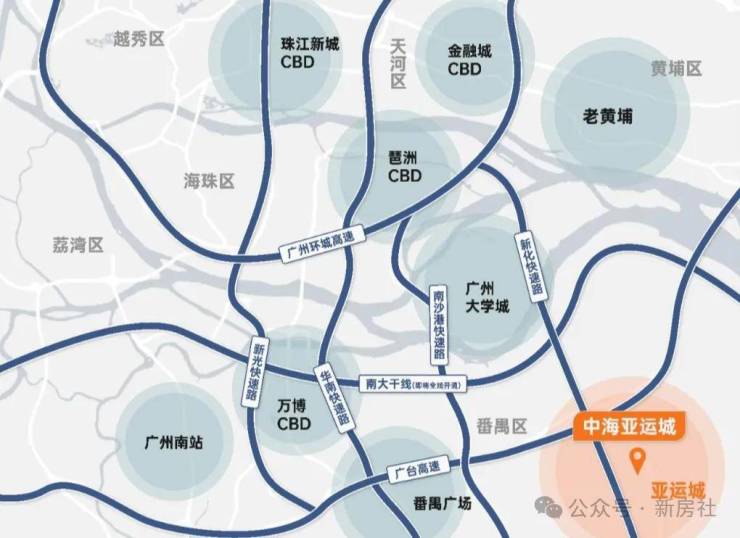 项目周边有三纵三横高速路网,京珠高速、南沙港快线,联动天河、海珠各区;规划南大干线形成佛山-番禺-南沙的快速通道;新华快速北段改线动工,未来亚运城瞬达琶洲电商总部。